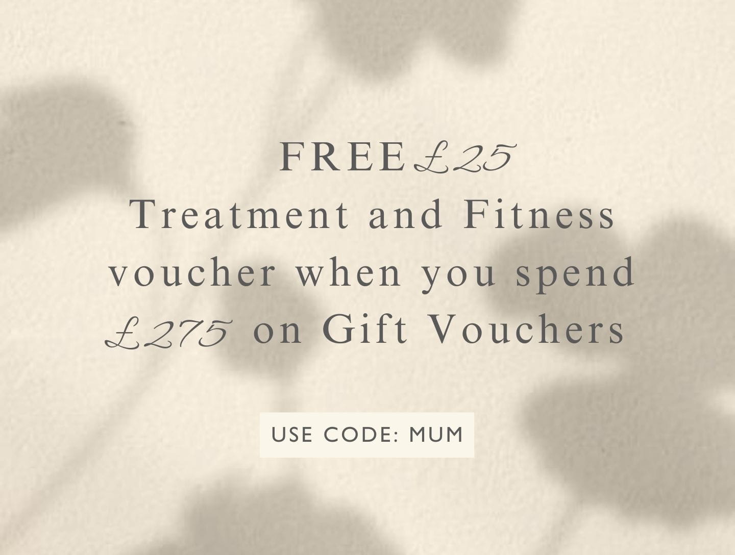 Receive a FREE £25 Treatment and Fitness voucher when you spend £275 or more on Gift Vouchers. Enter code ‘MUM’ at checkout.