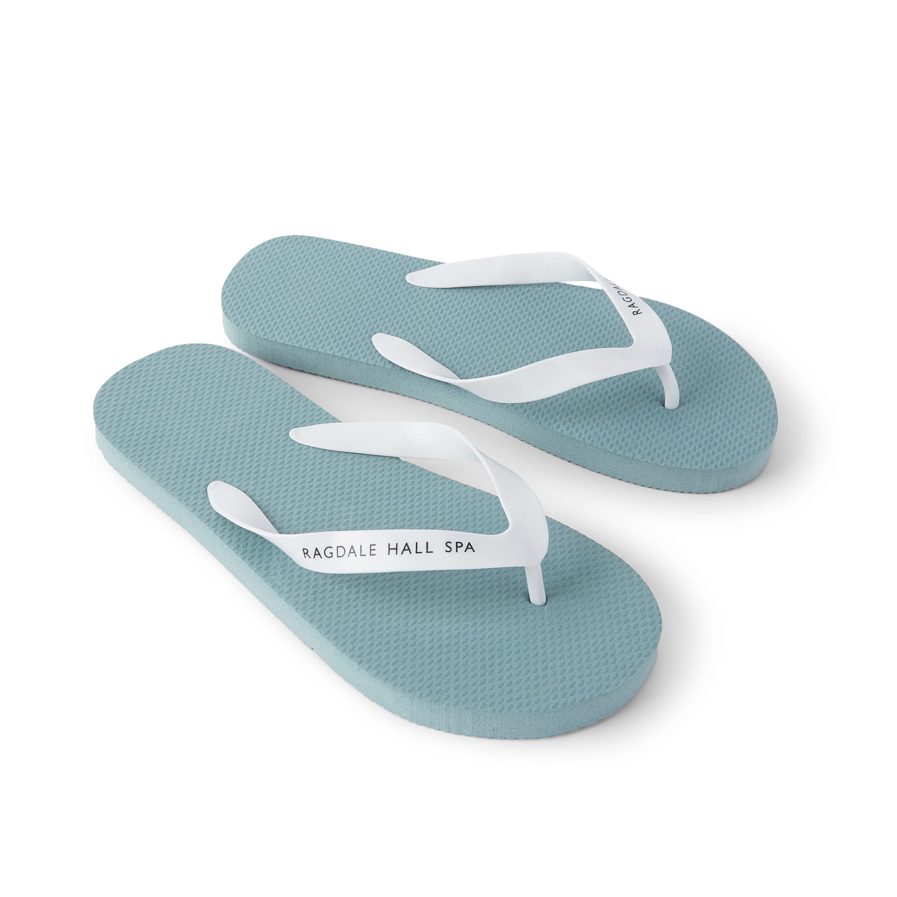 Ragdale Hall flip flops, presented in a white organza drawstring bag.